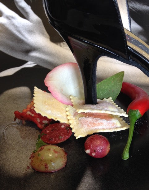 • Ravioli, Tomaten und Chili auf einem Teller. Die Ravioli sind von dem Absatz eines hochhackigen Schushs aufgespießt.
